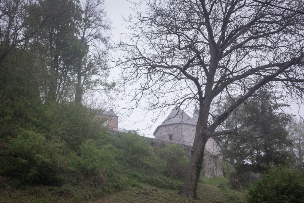 De laatste wandeling vanuit ons huisje in de Famenne. Vandaag loopt Maarten mee en we weten nog niet hoe lang de tocht zal worden. Op zijn kortst 13 kilometer. We vertrekken in de mist en die trekt maar langzaam op. We lopen langs dorpjes en kapelletjes.