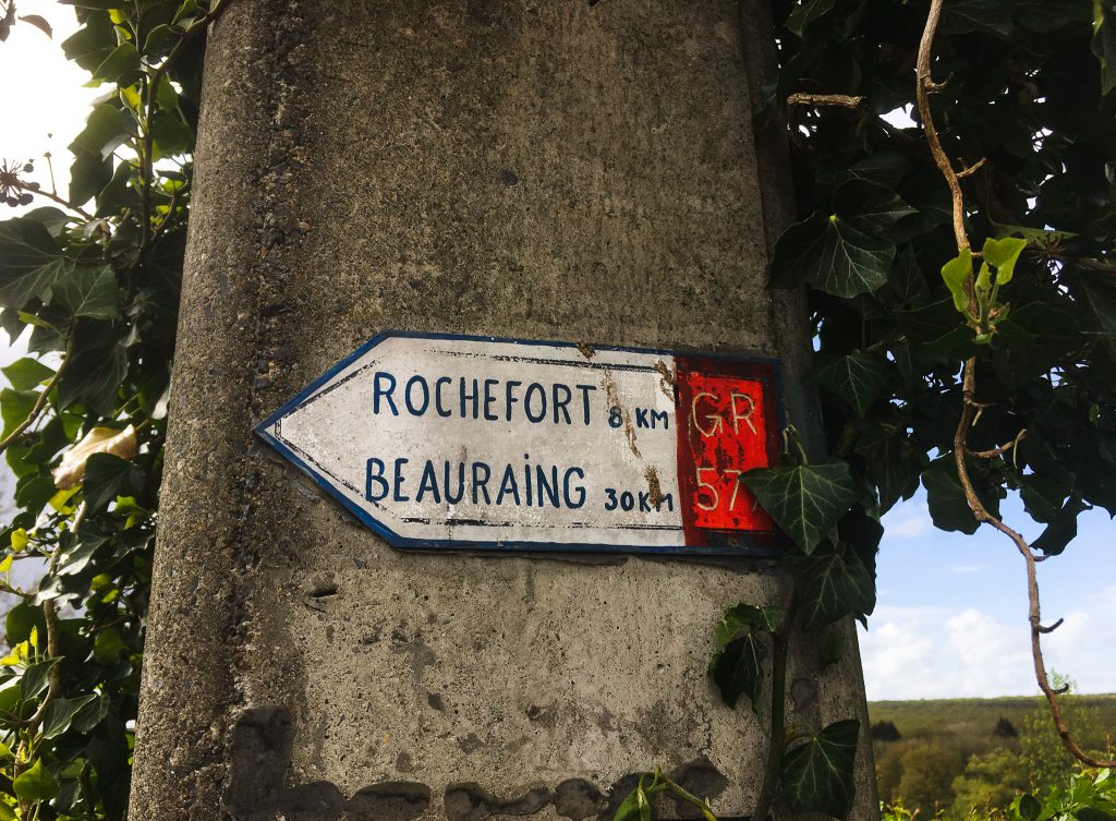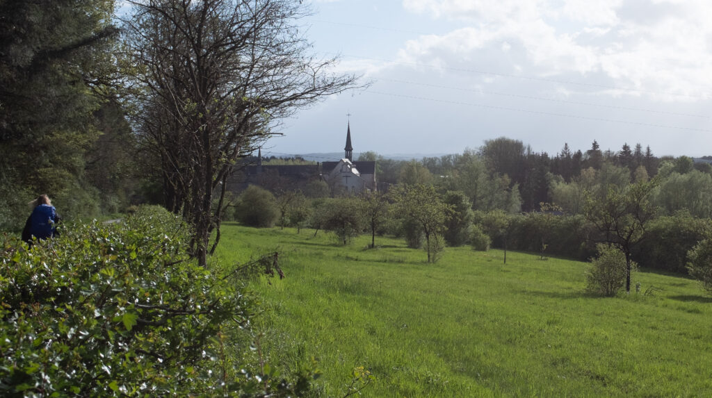 We genieten er van om weer een stuk te lopen. Het weer zit erg mee op een verdwaalde bui na. Na 14 km komen we aan bij de Abdij Notre-Dame de Saint-Rémy waar ze de Trapístes Rochefort brouwen.